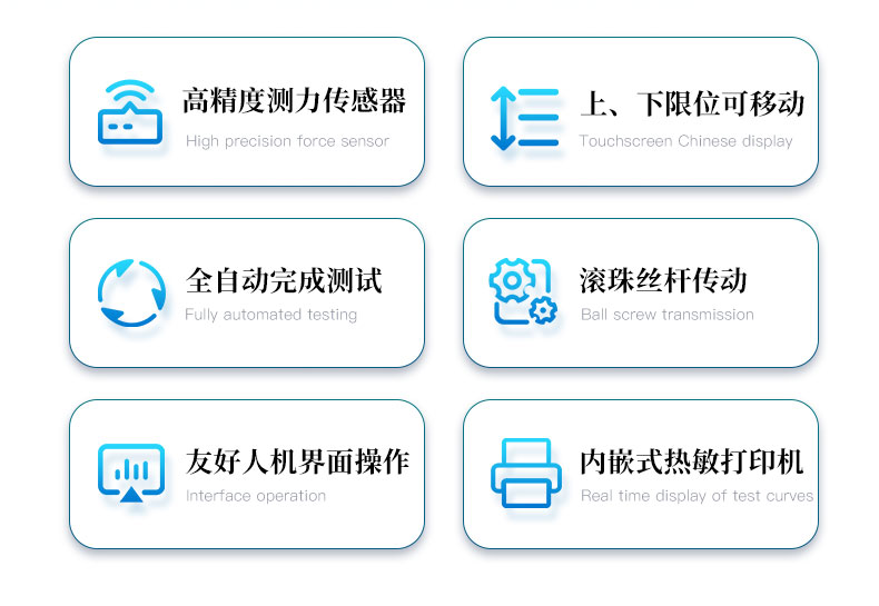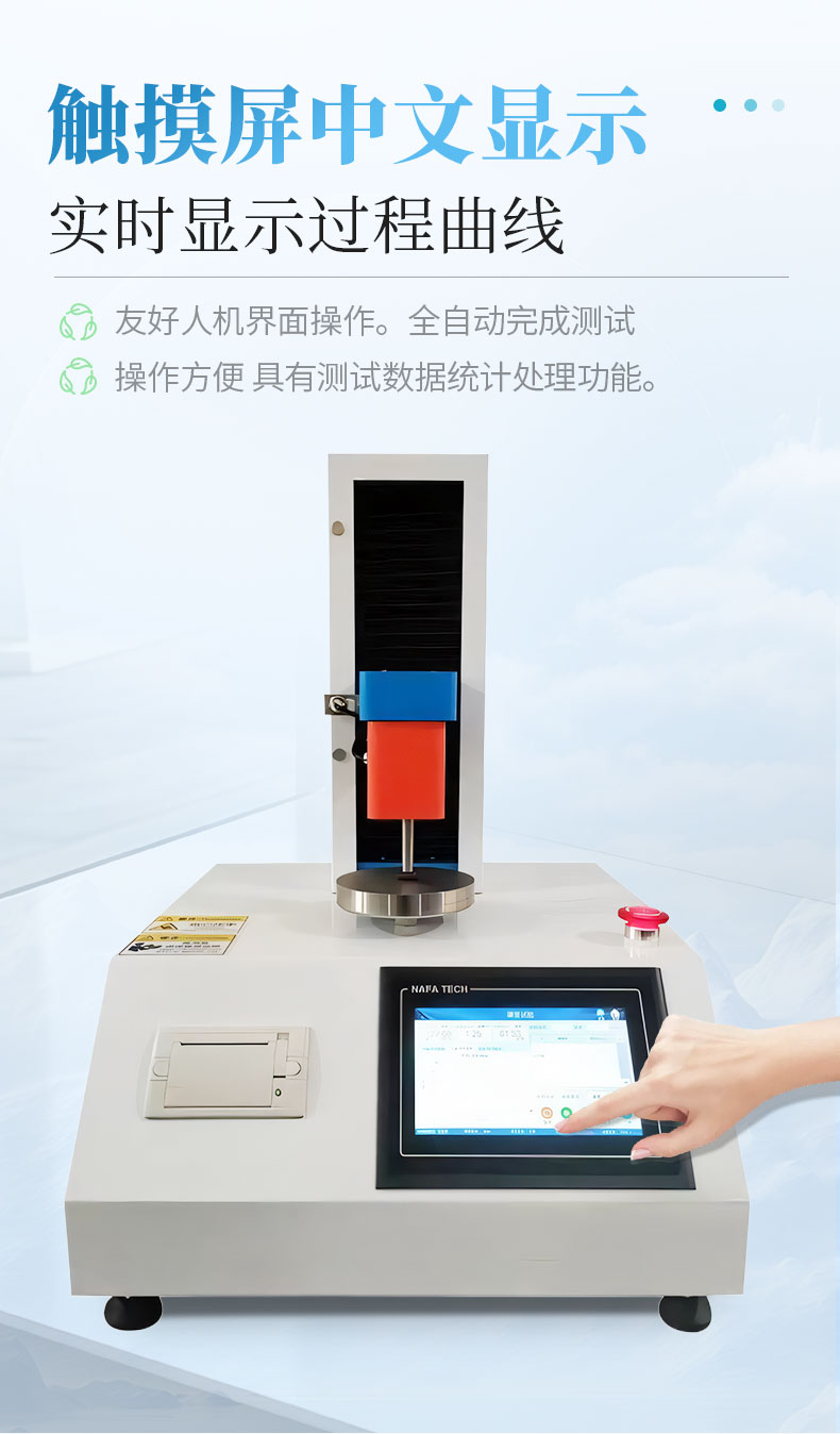 3、大觸摸屏中文顯示(可中英文切換),友好人機界面操作。全自動完成測試。操作方便,具有測試數據統計處理功能。