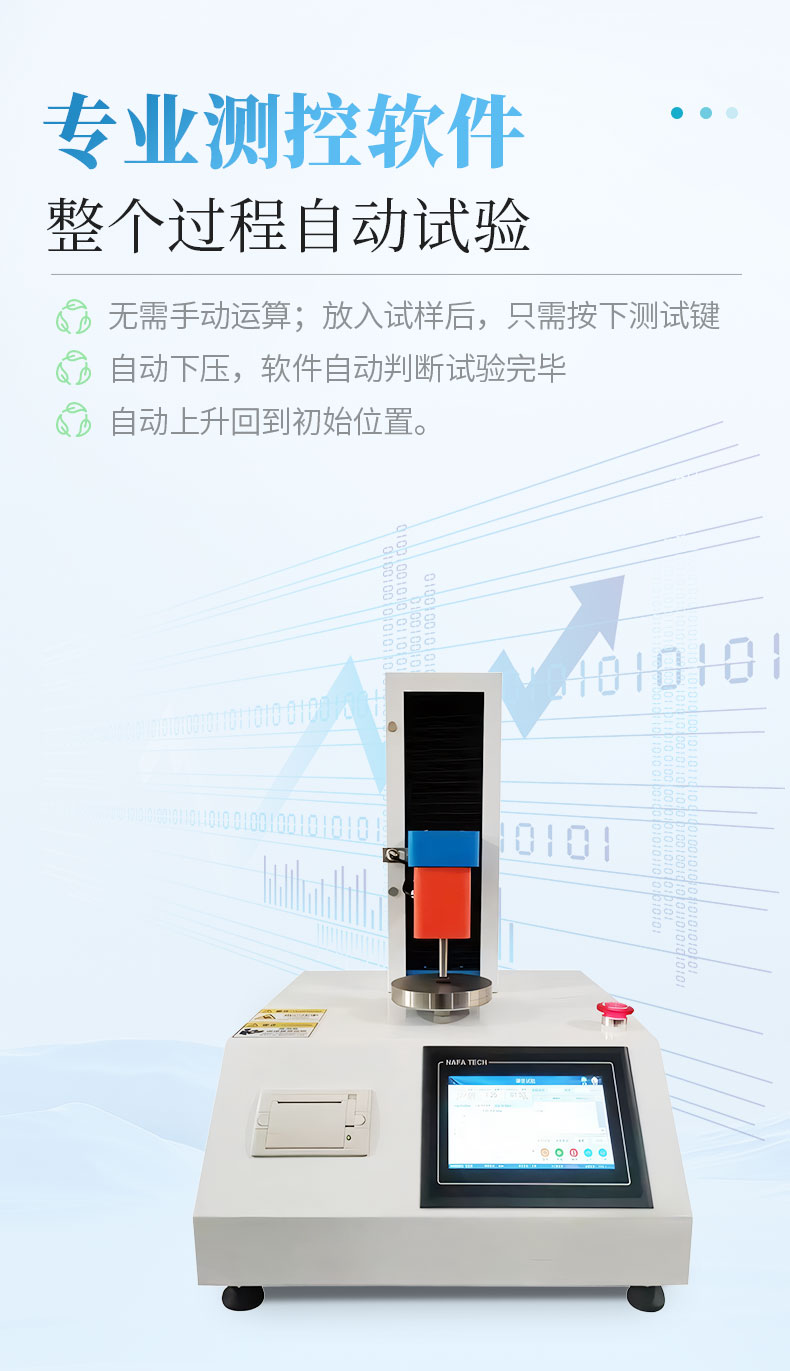 7、軟件:專業測控軟件,整個過程自動試驗,無需手動運算;放入試樣后,只需按下測試鍵,自動下壓,軟件自動判斷試驗完畢,自動上升回到初始位置。