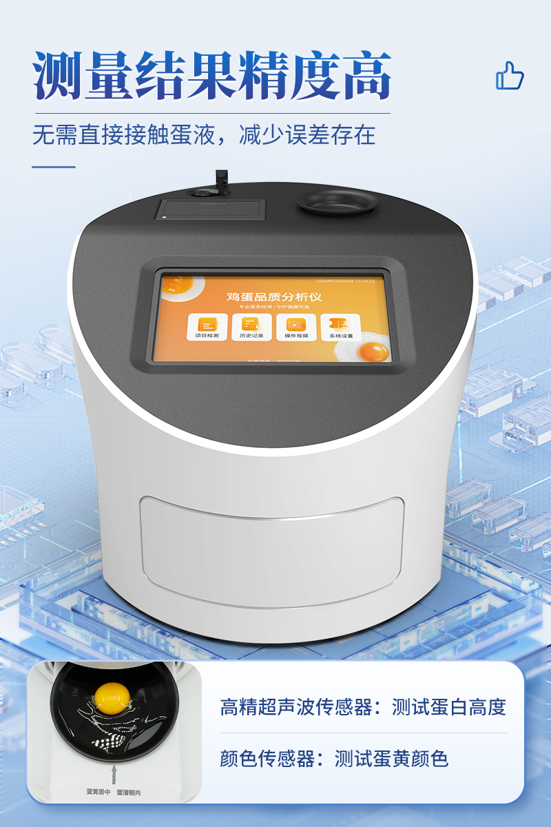 4.創(chuàng)新采用高精超聲波傳感器測(cè)試蛋白高度,精密傳感器測(cè)試蛋黃顏色,無(wú)需直接接觸蛋液,減少誤差存在。