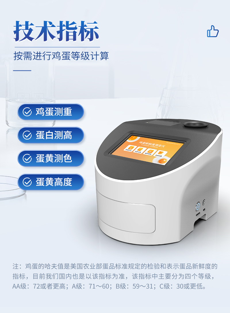 雞蛋品質(zhì)分析儀技術(shù)指標:雞蛋測重,蛋白測高,蛋黃測色,哈夫值顯示,蛋黃高度等,可進行雞蛋等級計算。雞蛋的哈夫值是美國農(nóng)業(yè)部蛋品標準規(guī)定的檢驗和表示蛋品新鮮度的指標,目前我們國內(nèi)也是以該指標為準,該指標中主要分為四個等級,AA級:72或者更高;A級:71~60;B級:59~31;C級:30或更低。