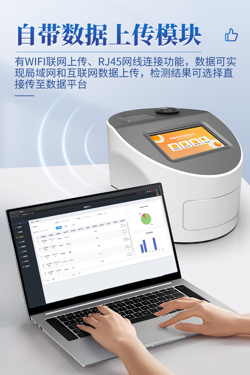 7.儀器可本機存儲數(shù)據(jù),可連接USB端口將數(shù)據(jù)導出存儲。另外,儀器自帶數(shù)據(jù)上傳模塊,具有WIFI聯(lián)網(wǎng)上傳、RJ45網(wǎng)線連接功能,數(shù)據(jù)可實現(xiàn)局域網(wǎng)和互聯(lián)網(wǎng)數(shù)據(jù)上傳,檢測結(jié)果可選擇直接傳至數(shù)據(jù)平臺,進行大數(shù)據(jù)分析處理與數(shù)據(jù)統(tǒng)計,達到長期分析監(jiān)測的目的。